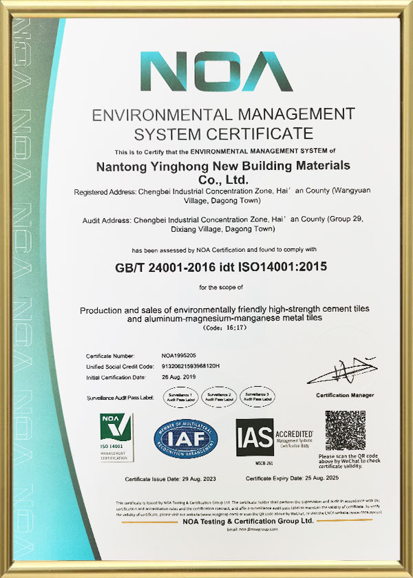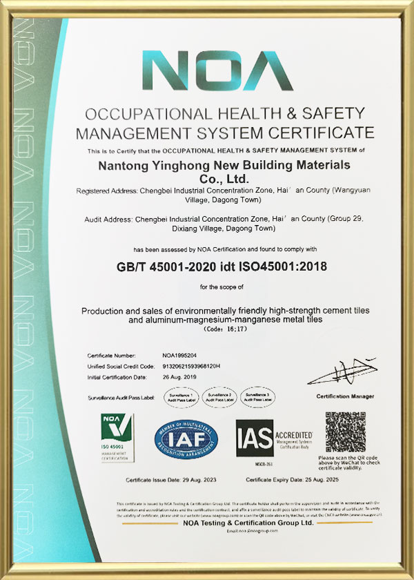 Alüminyum-magnezyum-mangan-mangan kompozit balık ölçeği metal çatı kiremitinin yüzeyi, asfalt lastik tabanını ultraviyole tabanından koruyan ve 50 yıllık bir ömre sahip olabilecek bir florokarbon silindir kaplama işlemine sahip 3003 serisi alüminyum-manganda alaşımdan yapılmıştır. Yüksek kaliteli yangın koruma performansına sahiptir: yüzey malzemesi A sınıfıdır, lastik tabanı B2 sınıfıdır ve birleştirilmiş iki malzeme B1.